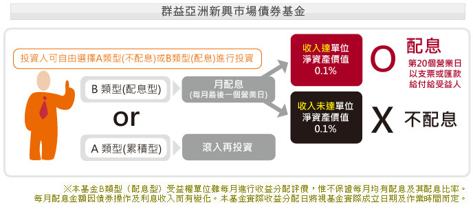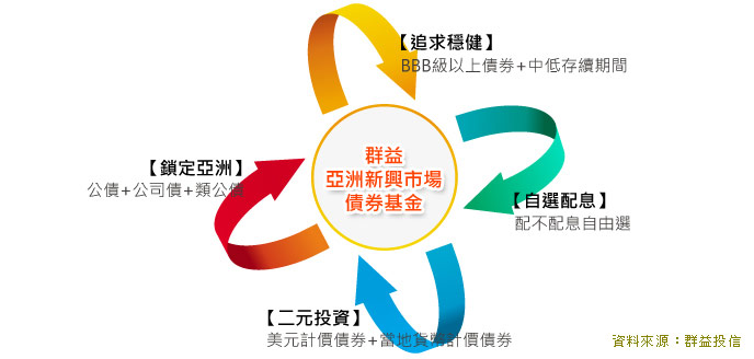 「群益亞洲新興市場債券基金」鎖定亞洲的公債、公司債及類公債等,為了追求穩定,投資標的均為BBB等級以上券種,佈局採美元與當地貨幣二元佈局,並搭配自由選擇的配息機制。