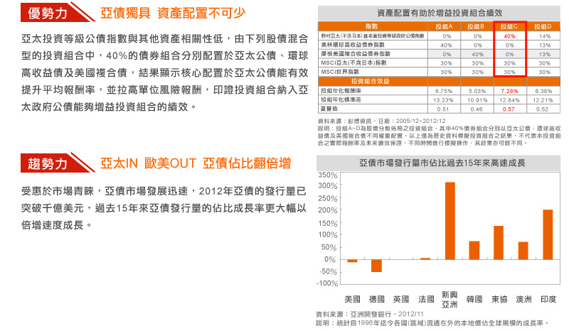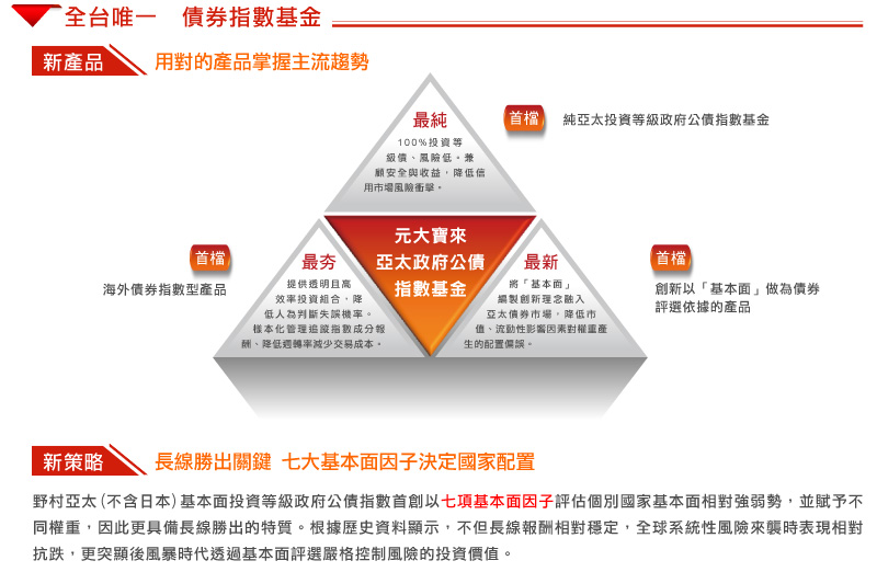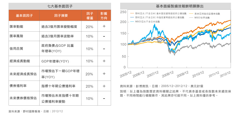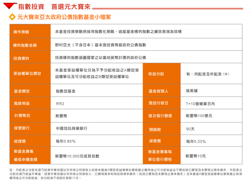 “Nomura Asia Pacific(ex-Japan)Fundamental Factor Investment Grade Government Bond Benchmark Index(中文名稱為「野村亞太(不含日本)基本面投資等級政府公債指數」)(「指數」)為野村國際(香港)有限公司(「野村國際香港」,野村國際香港及其聯屬公司統稱「野村」)的商標,及為元大寶來證券投資信託股份有限公司作為Yuanta Asia Pacific(ex-Japan)Investment Grade Government Bond Index Fund(「基金」)的唯一投資經理於特許權項下在本文件所提述。野村國際香港編製、維持及擁有指數及與之有關的權利。基金與指數並無關連,其項下或與之有關的任何付款亦並非參考指數、指數水平及/或指數表現(或未能表現)計算。基金並非由野村保薦、認可、銷售或推廣。野村不就基金的適當性作出聲明。野村對與基金有關的行政、市場推廣或買賣概無義務或責任,亦未曾以任何形式涉及基金的建構、開發及/或市場推廣。野村概不對基金或就基金而對任何投資者或第三方承擔責任。投資人於申購基金前,務請審閱基金公開說明書及銷售文件內有關野村的綜合免責聲明。”